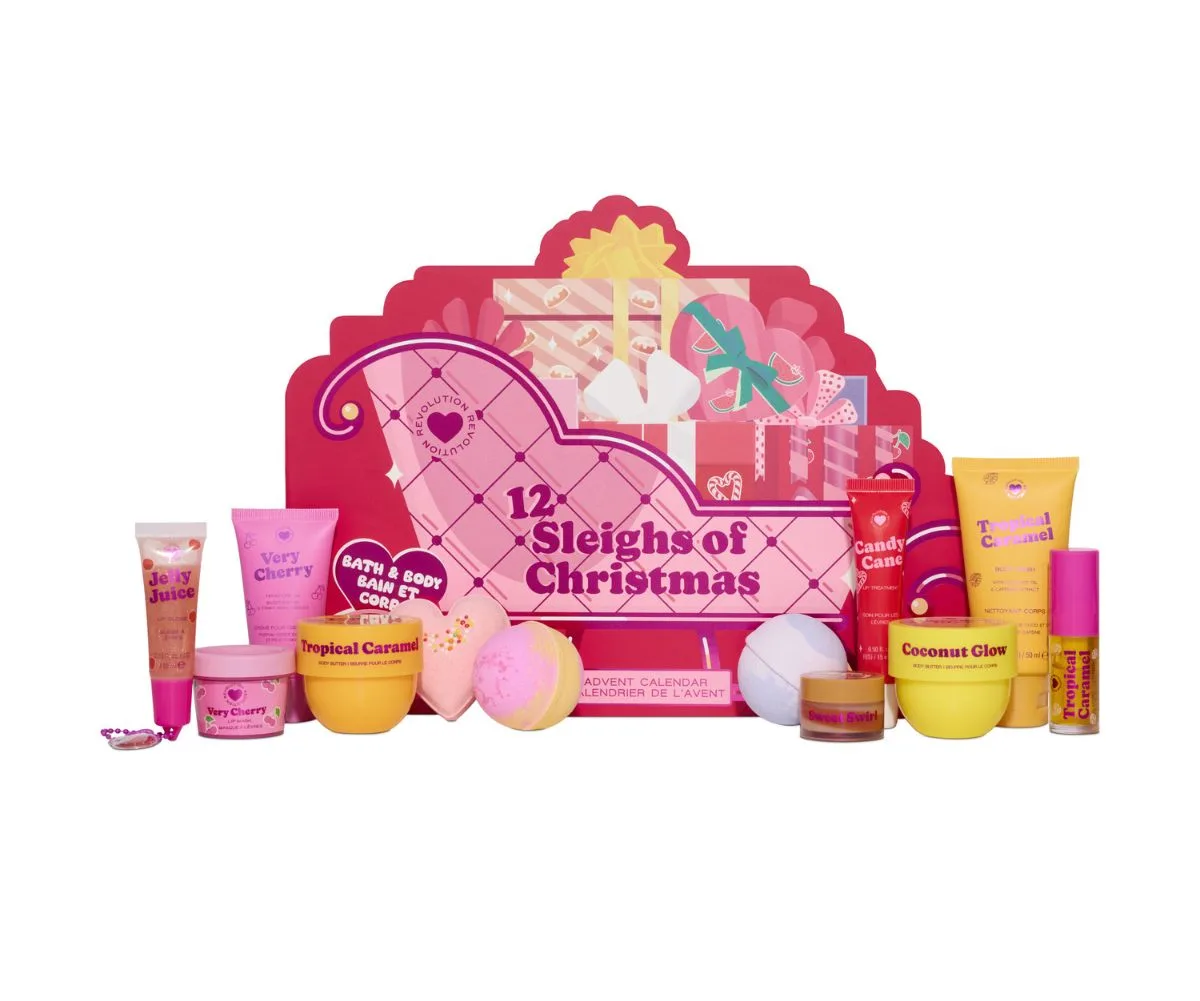Start your season right with the Revolution 12-piece beauty advent calendar, featuring everything you need from lip masks and bath bombs to body butters and more!