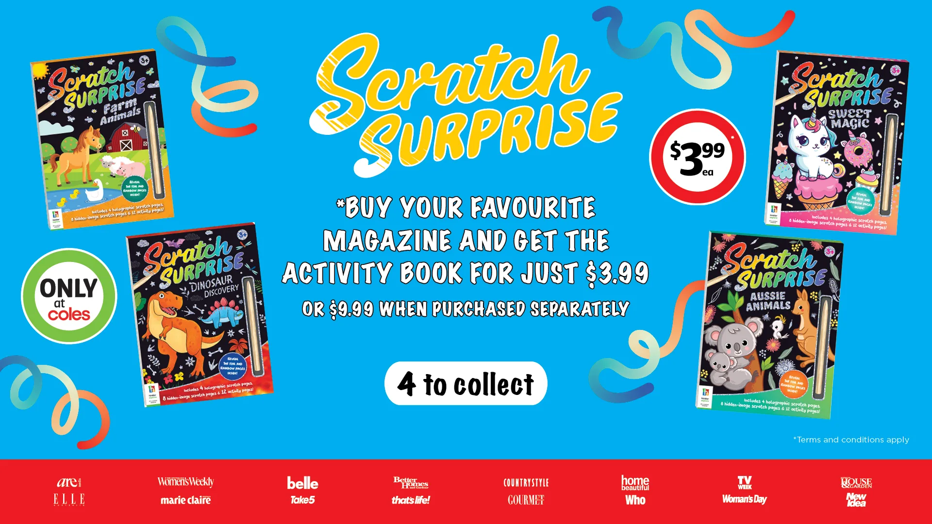 Terms and conditions: Available at selected Coles Supermarkets only (excluding Coles Express and Coles Online). Offer valid from 02/02/2026 to 10/03/2026 or whilst stocks last. The Scratch Surprise Activity Books are $3.99 each when sold with any participating magazine or $9.99 each when sold separately. Participating titles include all Are Media magazines (look for the Are Media logo near the barcode). Not valid in conjunction with any other offer. Four products to choose from.