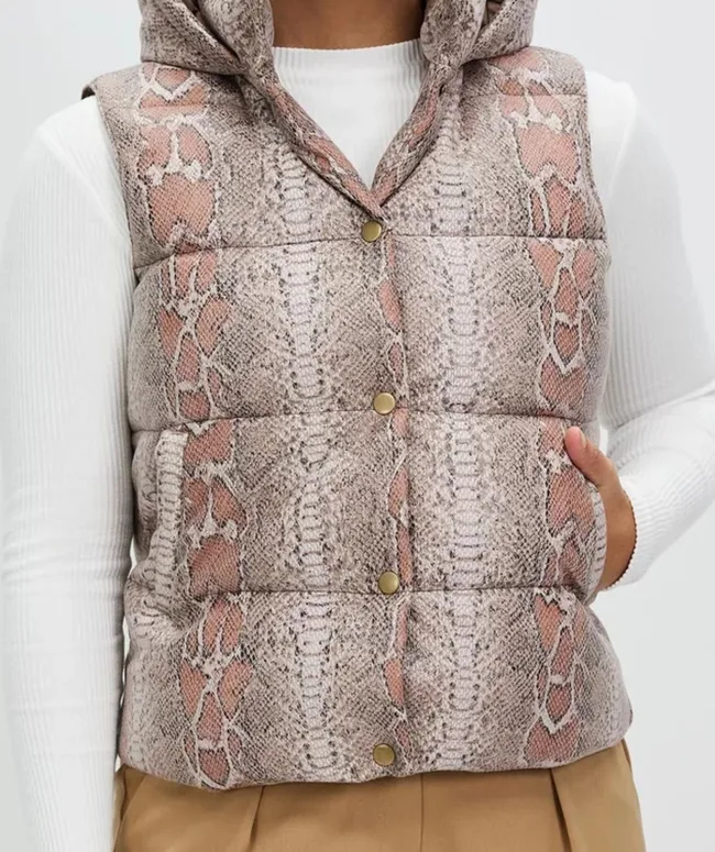 For a bit of pattern, opt for this python patterned puffer vest by PETA-certified Australian label, Unreal Fur. With a textured faux-snake print, sleek brass button closures and an attached hood, it will mean you’re cruising around in style.