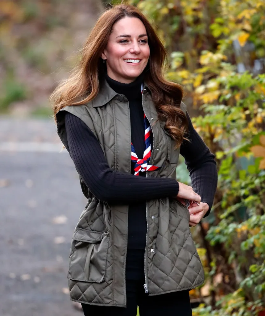Kate Middleton layers a thin quilted puffer vest over a black fitted long sleeve.