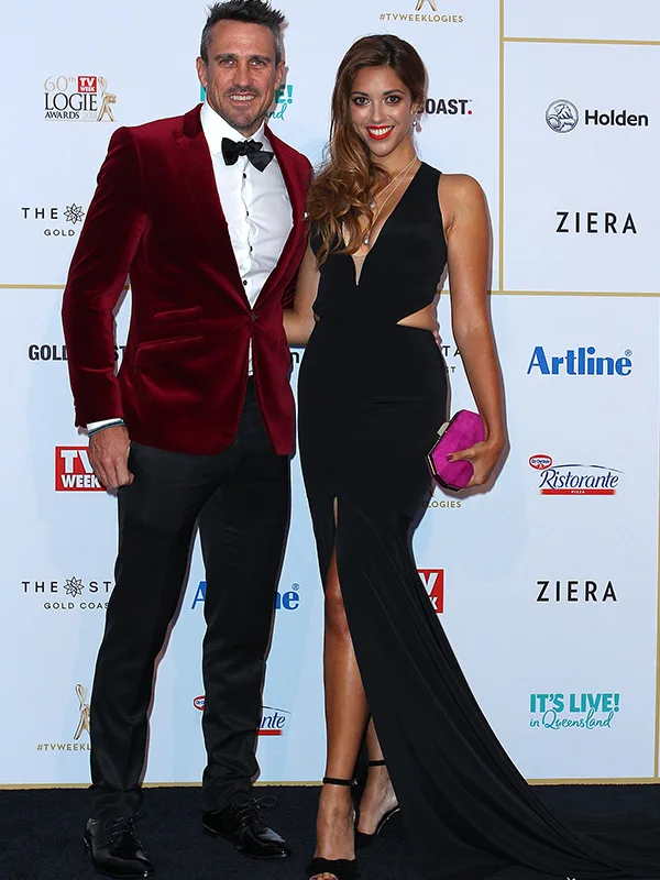 Survivor runner-up Lee Carseldine and actress Kristy Best are all smiles at the Logies. We love that Lee matched his velvet jacket to the ruby-red carpet he’s about to step out on to!