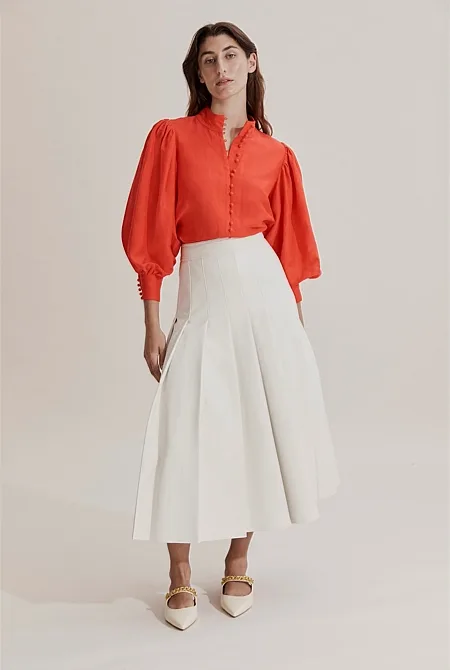 A pop of colour never goes amiss, and Nat’s Country Road puff-sleeve blouse with a classic Victorian collar is the perfect mix of classic and edge. Shop the style online below.