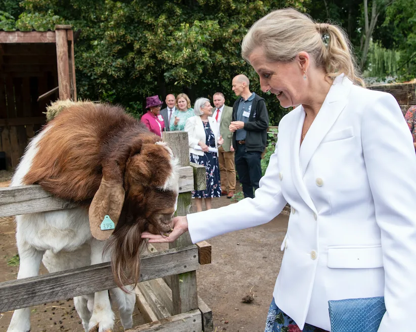 During the visit, she fed the animals and spoke to locals about their work in the English countryside location.