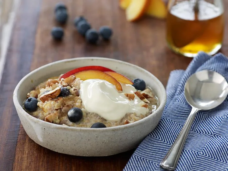 A great breakfast option for anyone who’s lactose intolerant — this cinnamon-spiced brekkie bowl is topped with fresh fruit and crunchy pecans for a delicious and healthy start to the day.