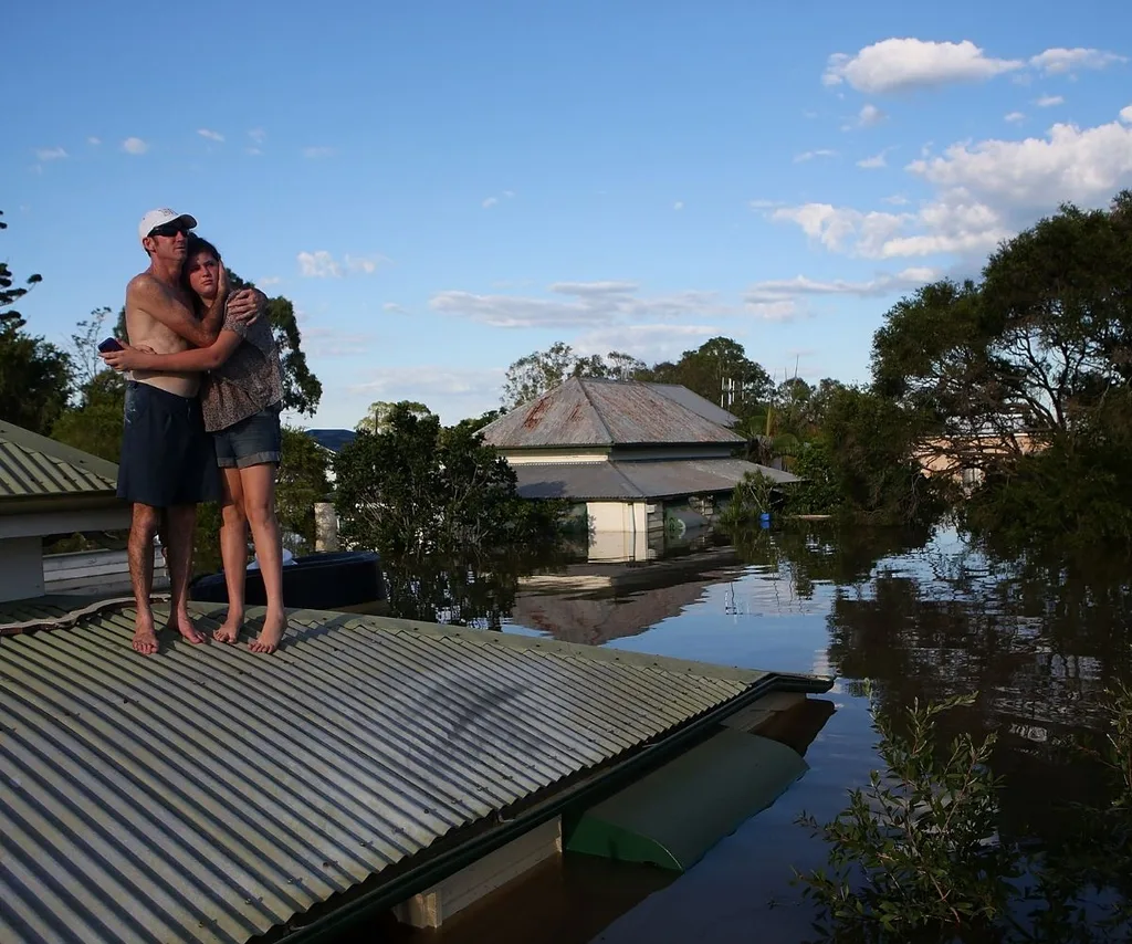 A couple embrace on the roof of their home in Queensland.