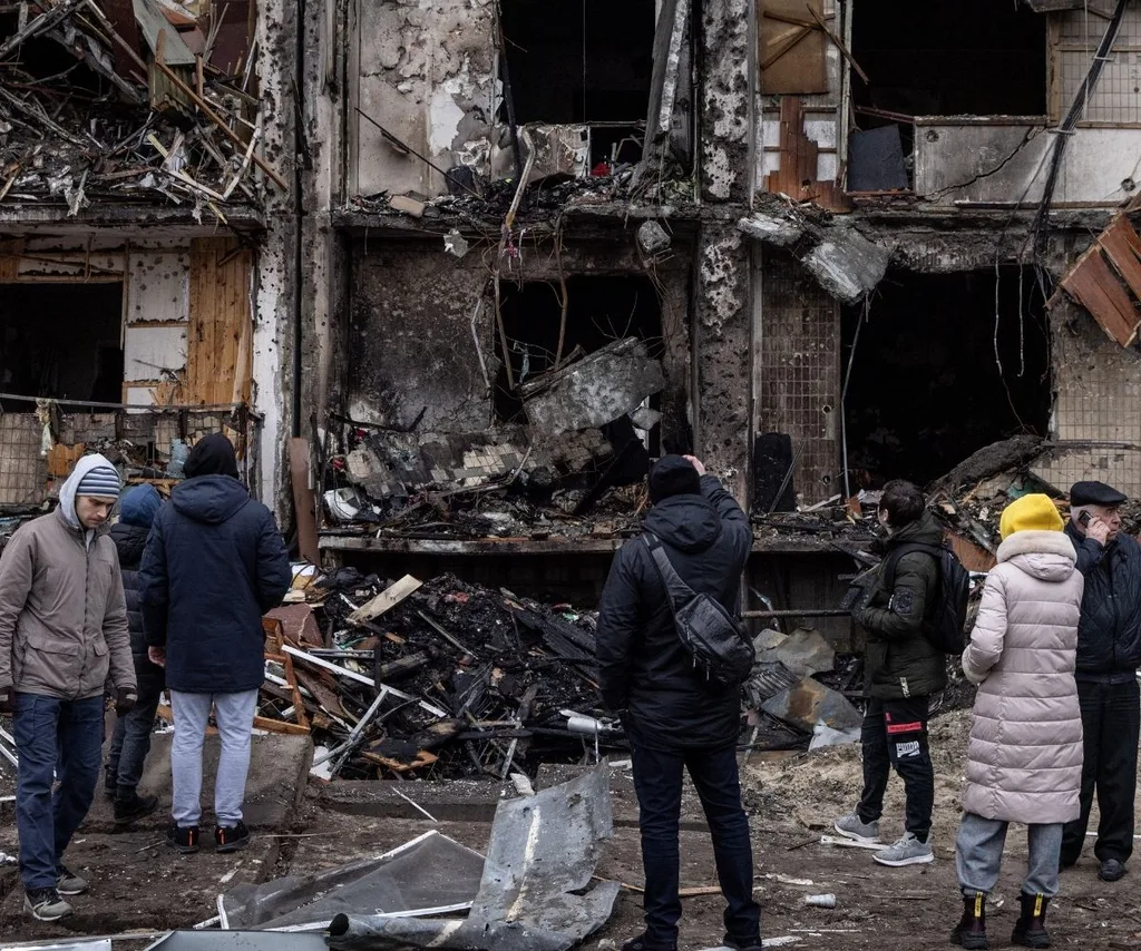 Ukrainians standing amongst the devastation.
